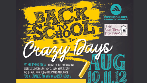 The Dickinson Area Chamber of Commerce Promotions Committee is excited to bring Crazy Days as a back-to-school Shop Local campaign! Shoppers who Shop Local at participating businesses can submit their receipts to be eligible for Chamber Bucks. The participating businesses include: 3rd Ave Floral & Greenhouse Glik’s JP FrameShop & Western Edge Gallery Little Pink…